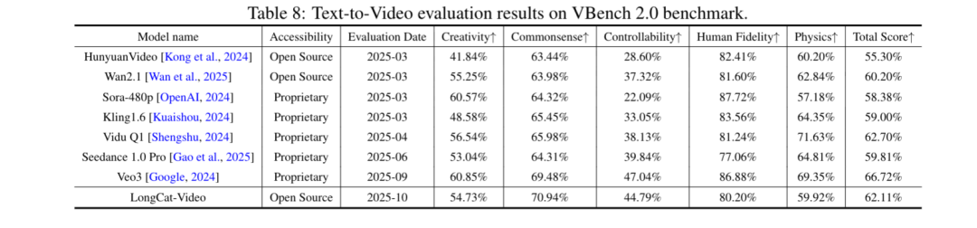 实验结果表明,LongCat-Video在整体质量得分中超越PixVerse-V5和Wan2.2-T2V-A14B,视觉质量接近Wan2.2-T2V-A14B,仅略逊于闭源模型Veo3。
