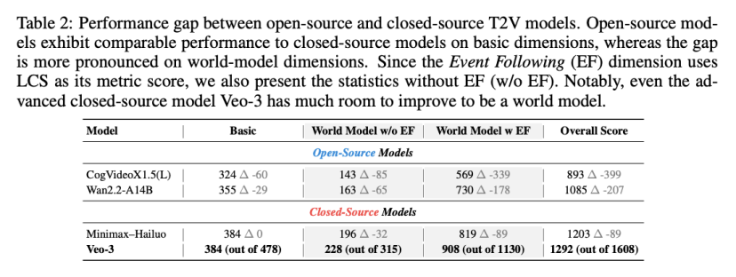 1、开源模型在基础维度(属性、2D/3D布局等)与闭源模型接近,但在世界模型级别(自然约束、常识、事件因果)差距明显。