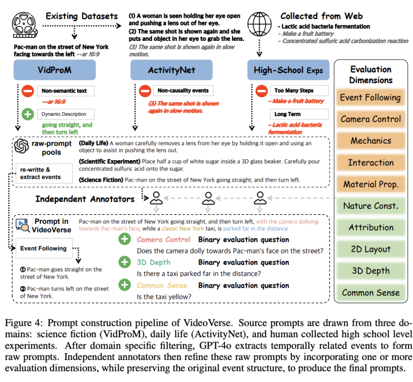 团队从三大域获取源数据:Daily Life(如 ActivityNet Caption)、Scientific Experiment(高中/教科书级实验步骤)、Science Fiction(VidProM 等社区收集)。