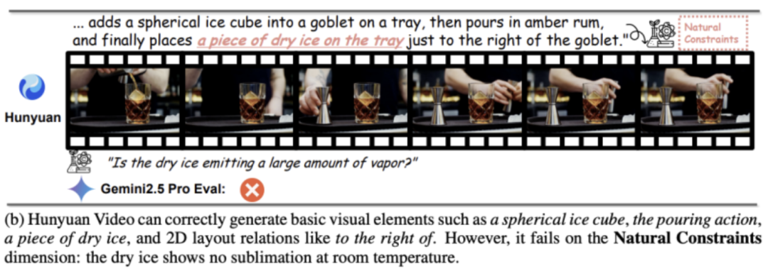 再如,Hunyuan Video能正确生成球形冰块、倒水动作、一块干冰,以及诸如“在右侧”等二维空间布局关系。