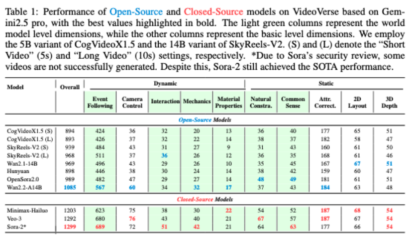 团队在VideoVerse上评测了主流开源与闭源模型(如 Wan 系列、HunyuanVideo、SkyReels、Veo-3 、Sora2等)。有两点关键发现: