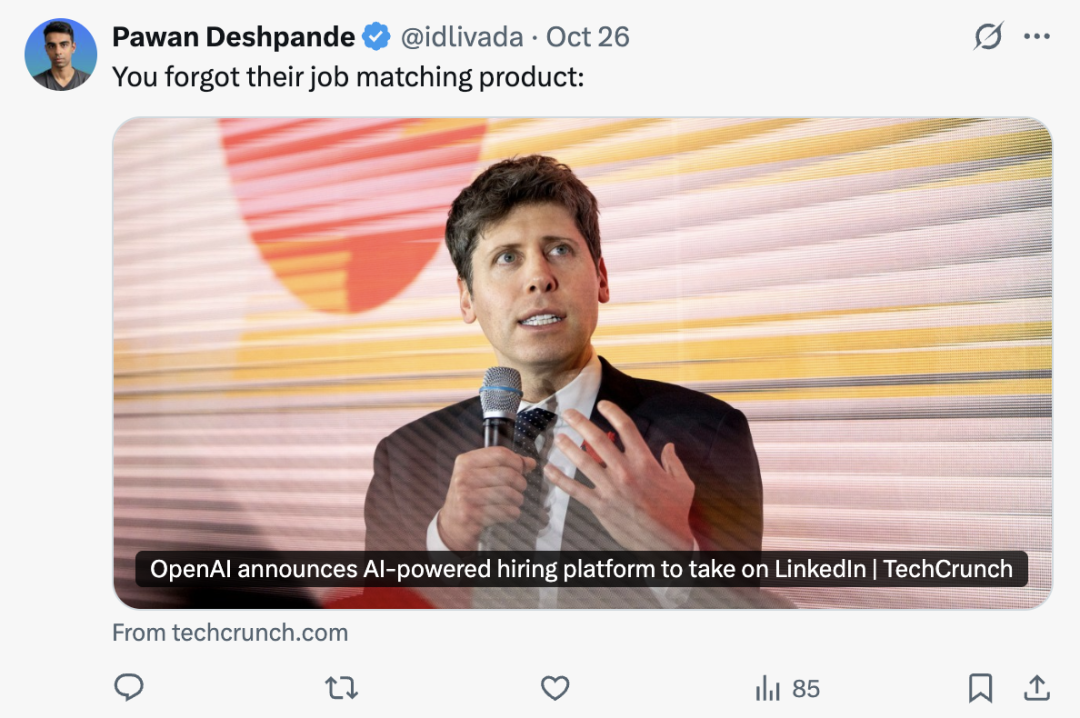 无他,虽然很难说奥特曼这一手操作有啥毛病,但看到全球最顶级AI公司所展现的“想象力”,不过是把AI融进现有架构,而非重新开天辟地,多少有点……