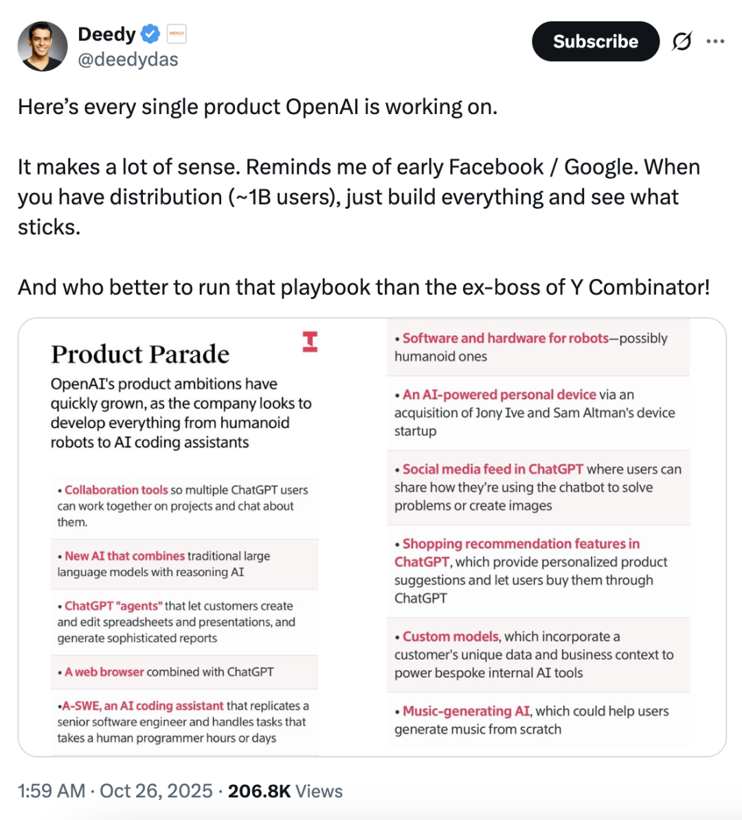 风投人Deedy在推特上整理了一份OpenAI现在的产品线,他表示这让他想起了当年的Facebook和Google: