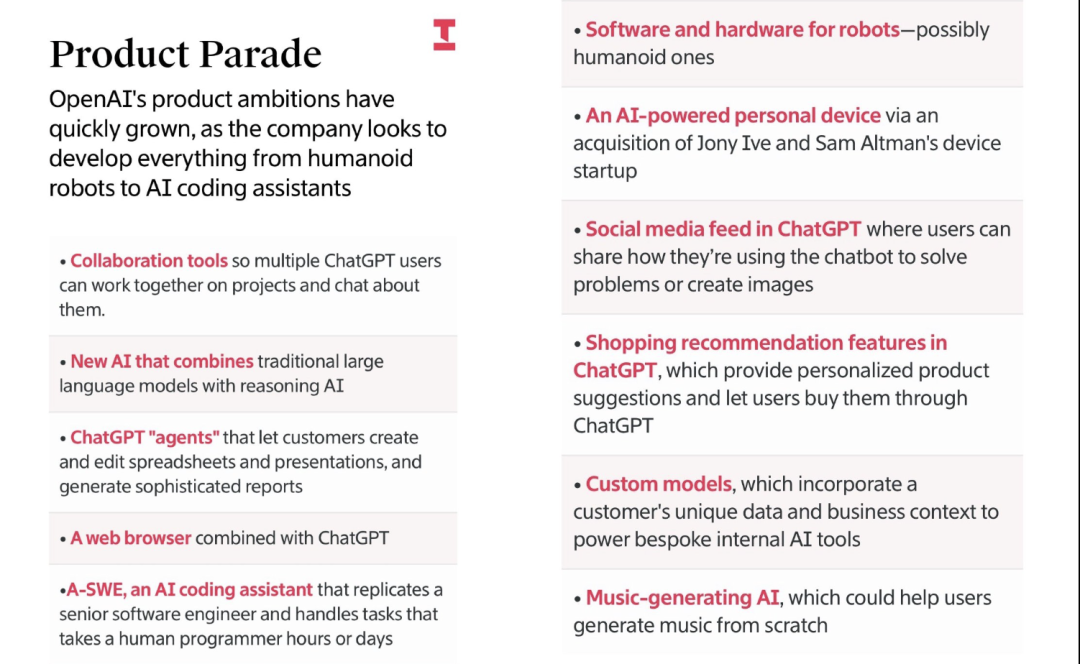 顶级分发渠道(ChatGPT)+ 铺开多条产品线——人形机器人、Agent、个人AI设备、社交、浏览器、购物、音乐、定制化模型……啥都有。