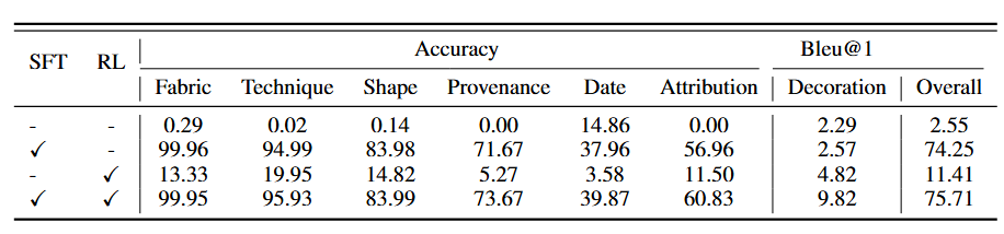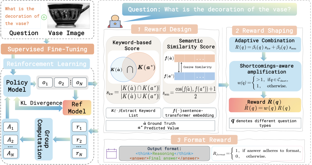 图2:VaseVL的整体框架。该方法将有监督微调(SFT)与基于组相对策略优化(GRPO)的强化学习相结合。给定陶瓶图像x、问题q 和参考答案a^*,模型通过在词汇奖励与语义奖励之间取得平衡,并限制策略偏离参考策略 ,从而提升其推理能力。