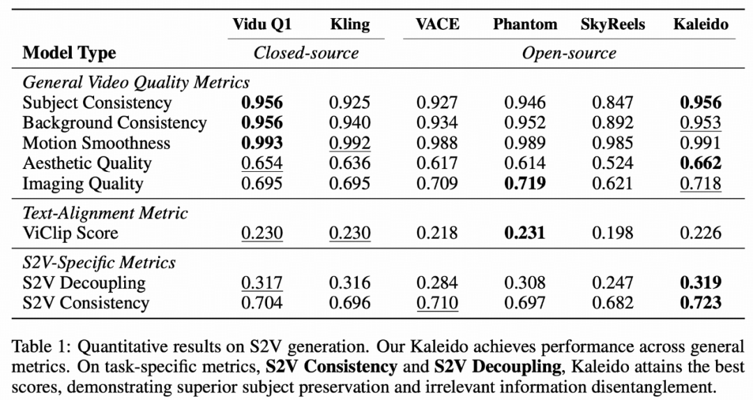 实验表明,Kaleido 在一致性、保真度和泛化能力方面均优于先前的方法,代表了 S2V 生成领域的重要进展。