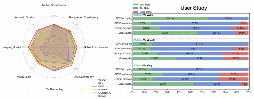 主观评测:用户调查中,Kaleido 在视频质量、主体一致性、背景解耦等方面均获最高平均分。