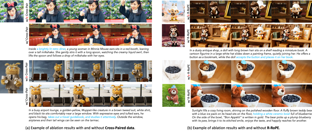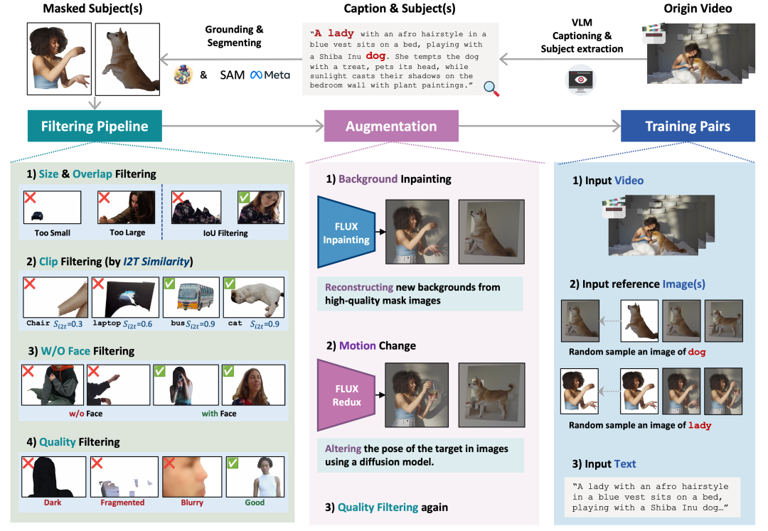 引入跨配样本(Cross-Paired Data) 生成:将主体图像与不相关视频配对打乱背景信息,迫使模型学习主体与背景的解耦。
