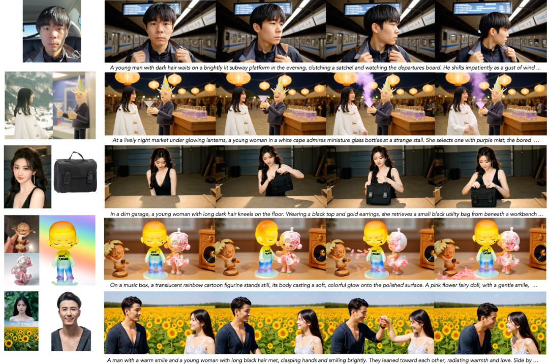 图|Kaleido的S2V生成,涵盖单人和多人场景中的人物、物体及可控背景生成。