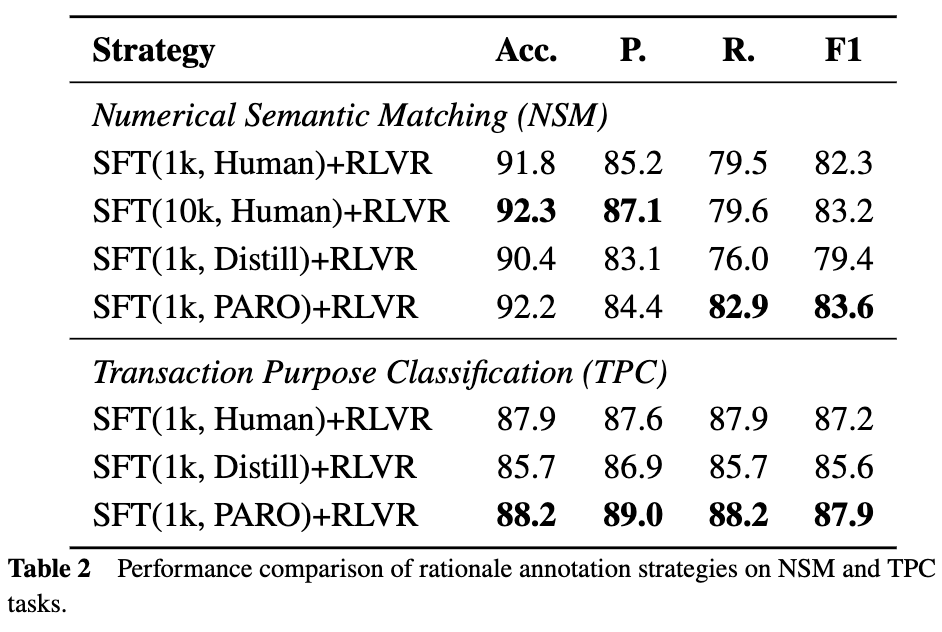 在NSM数据集上:SFT(1k, PARO)+RLVR的准确率与F1(92.2 / 83.6)几乎匹配SFT(10k, Human)+RLVR(92.3 / 83.2),仅使用大模型标注的1k条思维链即可达到10k人工标注思维链相当的性能。这是论文最直观也最有说服力的结论。