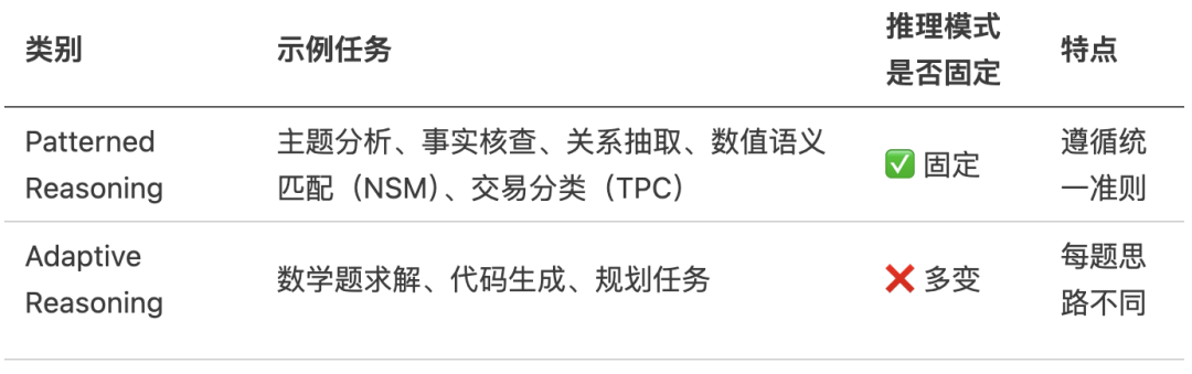 研究人员指出,很多金融、审计、法律、风控等工业界的任务(如自定义类别的分类任务、抽取类任务、审核类任务)本质上都是 patterned reasoning——同一套「执行步骤/判断流程」适用于不同实例,实例间主要差别是输入内容而非推理策略。