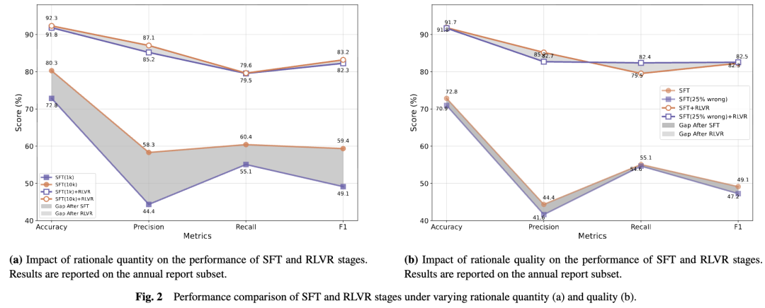 通过两个对照实验,研究人员揭示了在SFT + RLVR范式下,模型主要在SFT阶段学习到任务的推理模式,而人工思维链的数量与质量对最终性能的影响并不显著: