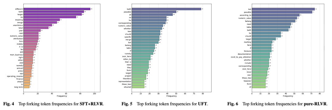 具体来看(见图3),SFT+RLVR 模型的forking token多为「任务关键词」(如 different, main_business),而pure-RLVR或UFT模型的forking token则更多是与任务无关的连接词或泛词(如but, because)。