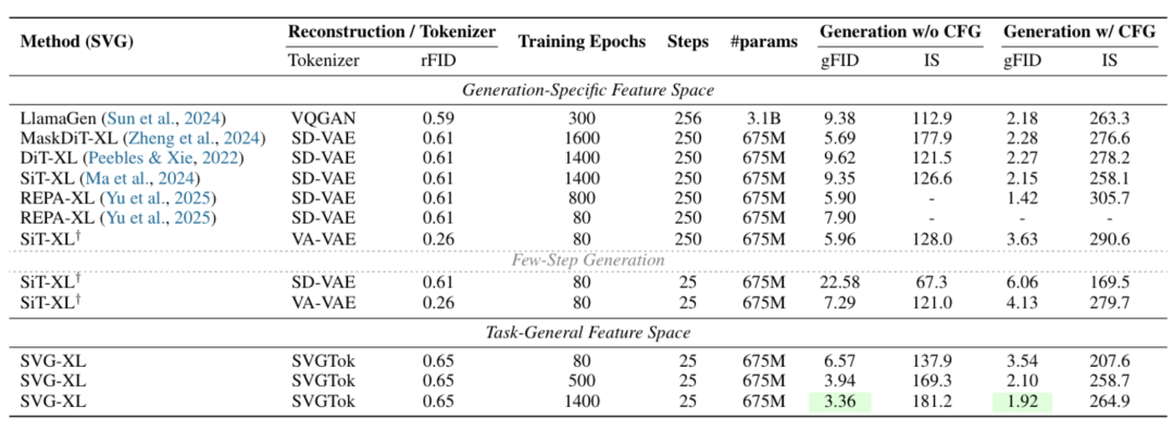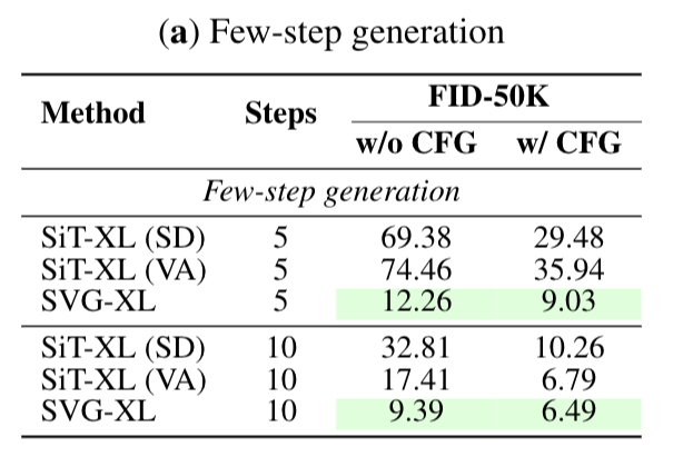 推理效率方面,消融实验中,5步采样时,SVG-XL的gFID为12.26,而SiT-XL(SD-VAE)为69.38、SiT-XL(VA-VAE)为74.46。这表明在较少的采样步数下,SVG-XL就能达到较好的生成质量。