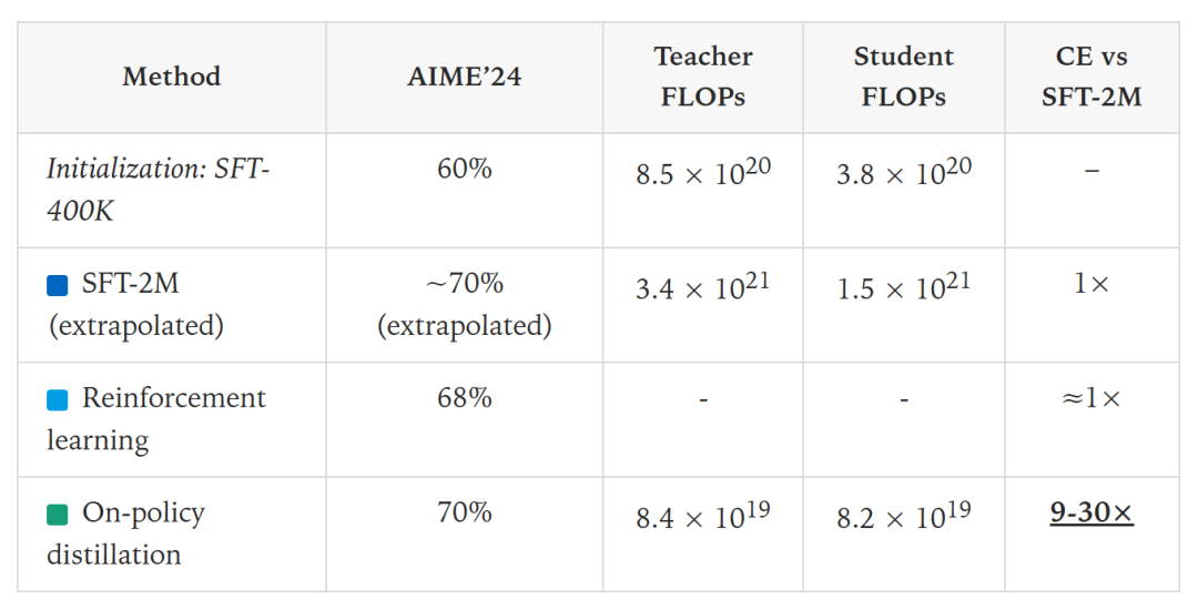 在线策略蒸馏:仅用了大约150个训练步骤就达到了70%的目标分数,与外推到200万样本的SFT相比,在线策略蒸馏的计算成本砍掉了9~30倍。