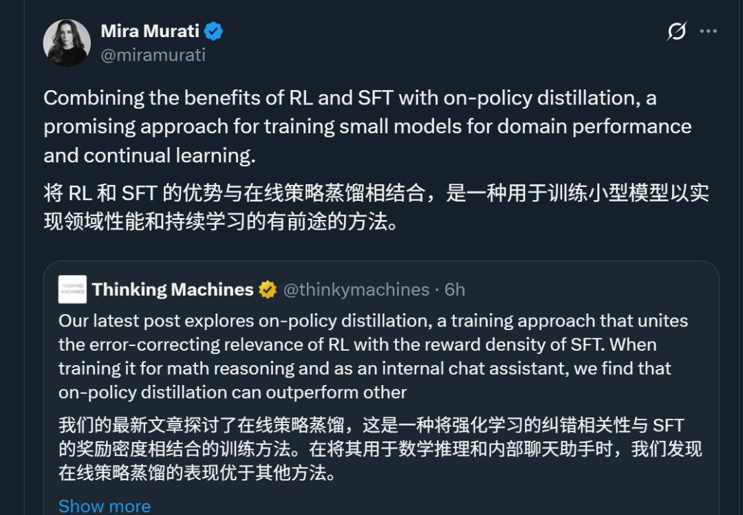 根据Mira Murati的提炼,原来他们提出了一种让小模型更懂专业领域的LLM(大语言模型)后训练方法——On-Policy Distillation (在线策略蒸馏)。