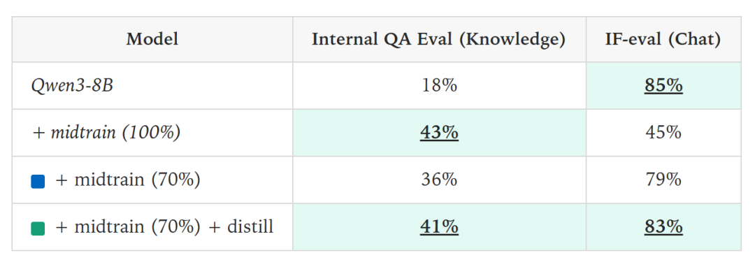 于是他们想到了,当模型因学习新知识而“遗忘”部分通用能力后,可以使用在线策略蒸馏进行修复——让“失忆”的模型向它自己最初的、能力完整的版本学习。