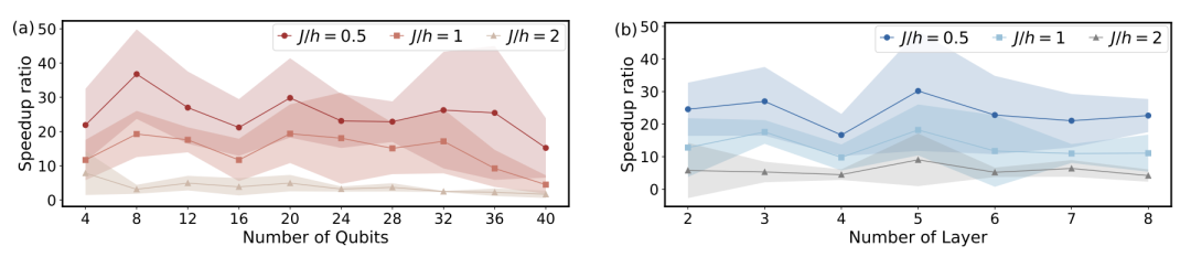 如图(a)所示,尽管随量子比特数量变化,加速比存在波动,但在