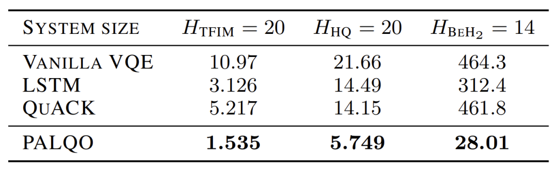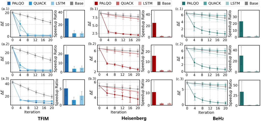 我们分别对比了 PALQO 在不同任务中的性能,包括采用 HEA 变分线路20量子比特的横场伊辛模型(TFIM)、采用采用 HVA 变分线路20量子比特的海森堡模型(Heisenberg),以及采用 UCCSD 变分线路14量子比特的 BeH₂ 分子。