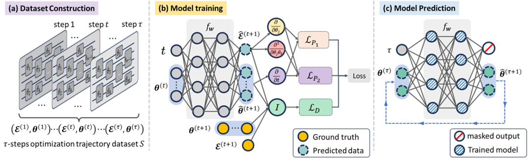 基于这一理论框架,我们设计了一种名为 PALQO 的方案,借助物理信息神经网络[8]近似求解该 PDE。方案的整体流程下图所示,包括三个阶段:数据集构建、模型训练与模型预测。首先如图(a)所示生成数据集