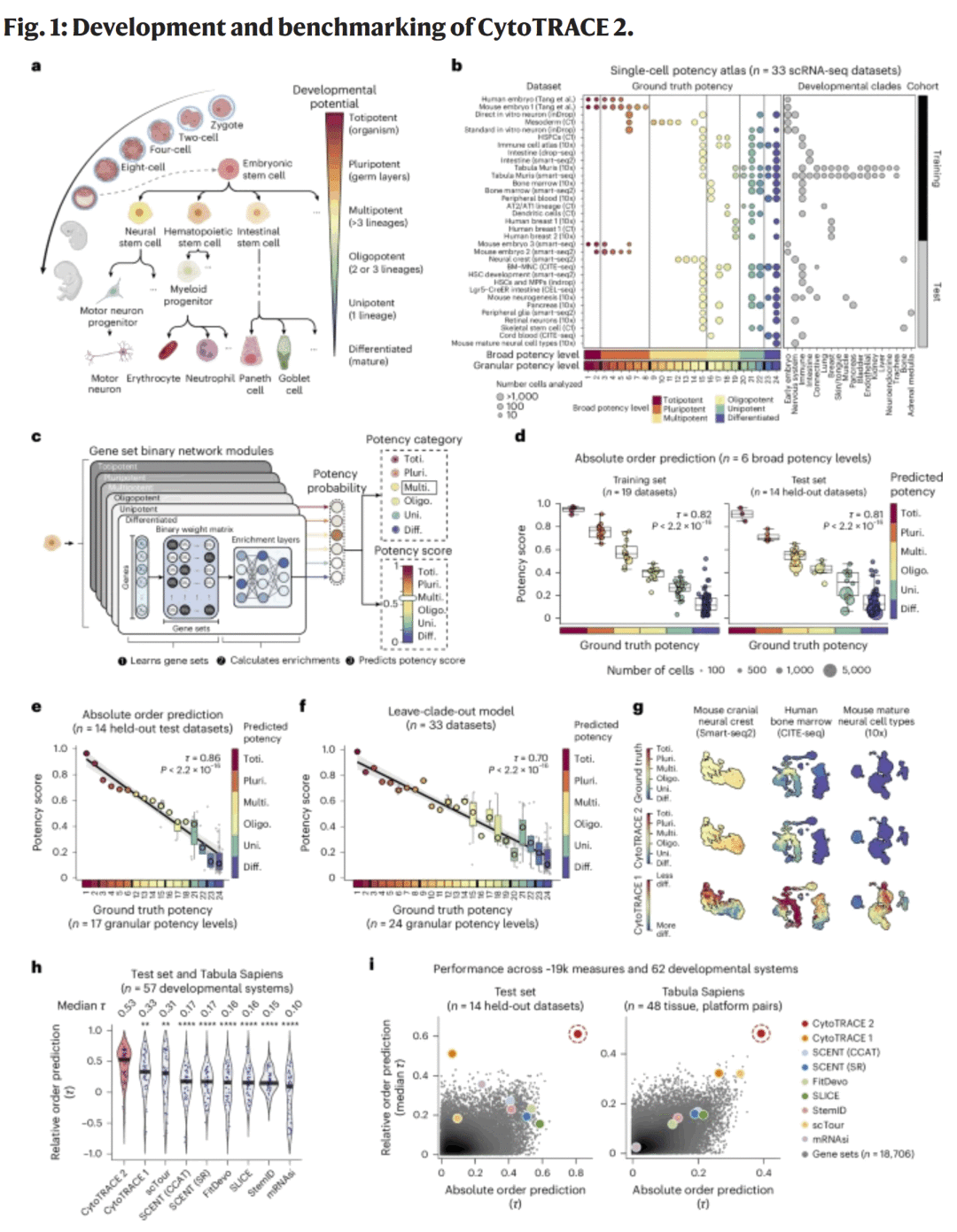 CytoTRACE 2 结合转录组复杂度(transcriptional diversity)与数据驱动特征选择,利用超过 2000 个高质量单细胞数据集进行训练与验证。与前一代算法相比,该模型在干细胞分化轨迹重建、发育状态排序及跨组织预测任务中均表现出显著优势,尤其在多物种与多测序技术背景下的泛化性更强。研究人员还引入 基因重要性评分(gene importance scoring) 模块,使模型能识别影响发育潜能的关键基因,从而在机制研究中具有解释性价值。