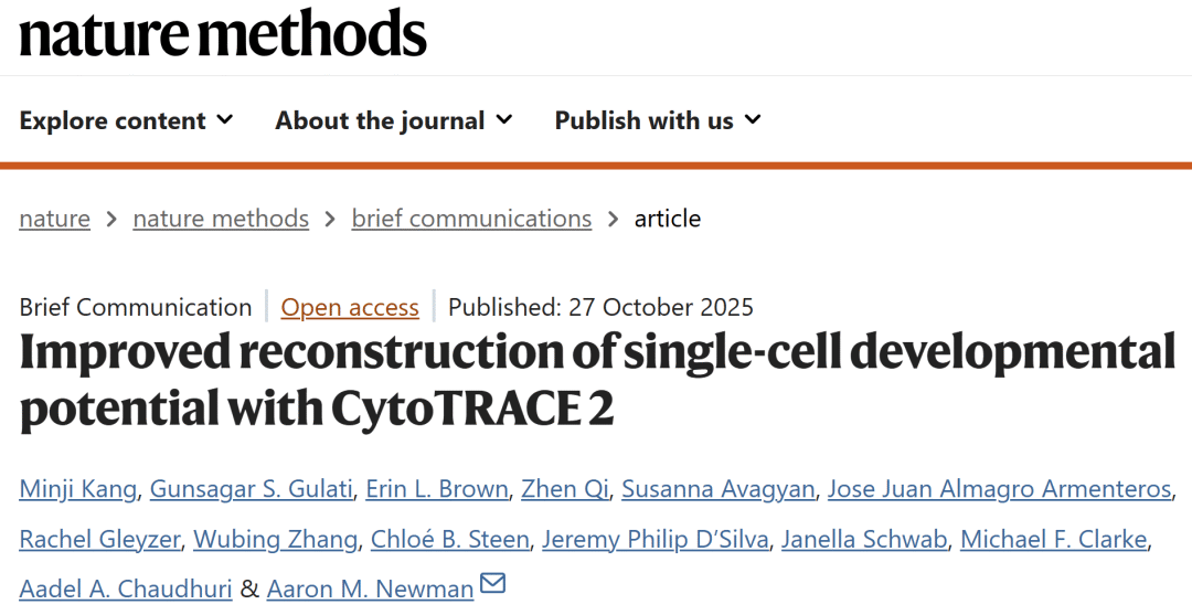 Kang, M., Gulati, G.S., Brown, E.L. et al. Improved reconstruction of single-cell developmental potential with CytoTRACE 2. Nat Methods (2025).