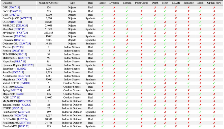 论文收录了超过 30 个常用 3D 数据集(见第 13 页表 1),涵盖对象级、室内、室外、静态与动态场景,标注模态包括 RGB、深度、LiDAR、语义与光流等。