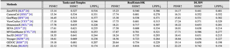 同时总结了 PSNR / SSIM / LPIPS(图像质量),Chamfer Distance(几何精度),AUC / RTE / RRA(相机姿态)等标准指标体系,为未来的模型比较提供统一基线。