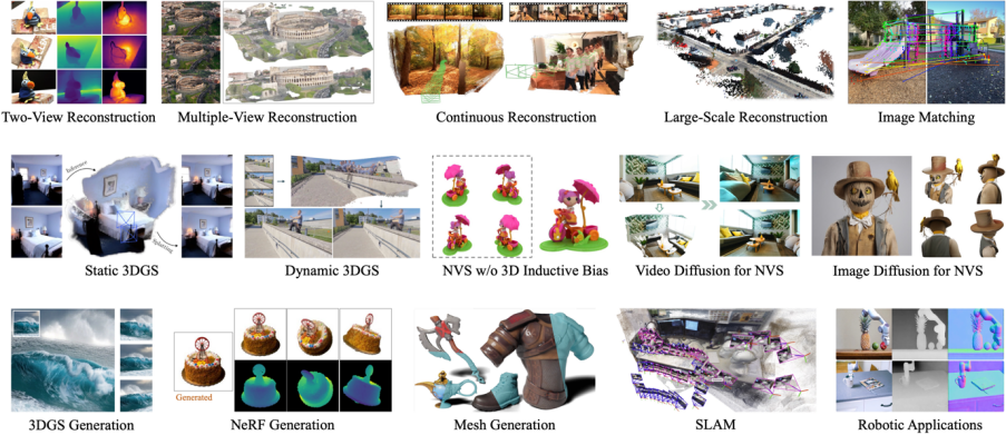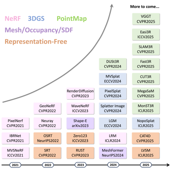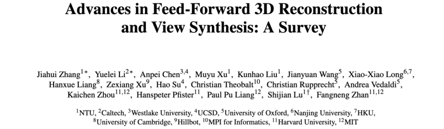 这篇由NTU、Caltech、Westlake、UCSD、Oxford、Harvard、MIT 等 12 所机构联合撰写的综述论文《Advances in Feed-Forward 3D Reconstruction and View Synthesis》,主要总结了过去五年(2021–2025)间涌现的数百项创新工作,首次建立了完整的 Feed-Forward 3D 方法谱系与时间线。