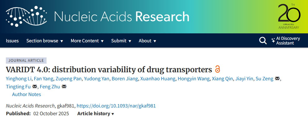 Yinghong Li, Fan Yang, Zupeng Pan, Yudong Yan, Boren Jiang, Xuanhao Huang, Hongyin Wang, Xiang Qin, Jiayi Yin, Su Zeng, Tingting Fu, Feng Zhu, VARIDT 4.0: distribution variability of drug transporters, Nucleic Acids Research, 2025;, gkaf981