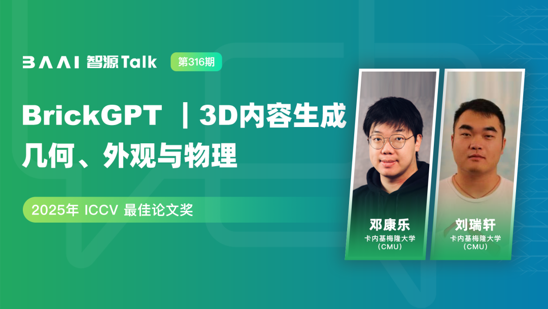本期报告将由卡内基梅隆大学邓康乐和刘瑞轩进行分享。随着虚拟现实(VR)、增强现实(AR)及其他3D应用的普及,开发能让普通用户创建自有3D内容的技术,已变得至关重要。然而,当前的3D创作流程往往需要繁琐的手动操作或专业的捕捉设备。此外,生成的模型资产也常存在光照烘焙、表示不一致与物理合理性缺失等问题,从而限制了其在下游应用中的使用。本报告将讨论利用数据先验的方法显著降低3D内容创作的门槛。通过利用来自其他模态、大规模数据集及预训练生成模型的信息,本研究将用户输入的负担降至仅需随意拍摄的照片、简单草图或文本提示。我们首先展示了如何利用深度先验,使用户无需密集数据采集即可实现3D场景的数字化,并探讨了如何通过草图等2D用户输入实现交互式3D编辑与生成。随后,我们提出了一个端到端的文本到3D生成流程,能够同时生成3D资产的几何与纹理。在几何生成方面,我们提出了一种基于八叉树的自适应标记方案,它能根据形状复杂度分配表示能力,从而实现更高保真度且更高效的3D形状重建与生成。在外观建模方面,我们利用数据与扩散模型先验,通过文本输入在网格上生成可重新打光的纹理,确保生成的3D对象能在下游生产流程中直接使用。最后,为了使数字设计与现实世界接轨,我们引入了BrickGPT,它融合了制造与物理约束,能够根据文本提示生成物理结构稳定且可实际搭建的积木结构。总而言之,这些研究系统性地攻克了几何、外观与物理生成中的核心挑战,从而实现了从高层用户意图创建可用、可编辑且符合物理规律的3D内容。邓康乐(Kangle Deng),卡内基梅隆大学(CMU)博士,师从Deva Ramanan与朱俊彦(Jun-Yan Zhu)教授。他的研究工作荣获2025年ICCV最佳论文奖(Marr Prize),并获得微软博士奖学金(Microsoft Research Fellowship Award)支持。本科毕业于北京大学,在校期间凡符合评选资格年份,均荣膺国家奖学金(共三次,获奖比例前1%)。其主要研究方向为3D生成,在CVPR、ICCV、ECCV、NeurIPS、ICLR等国际顶级会议上发表论文10余篇。刘瑞轩,卡内基梅隆大学计算机科学学院机器人研究所博士生,师从刘畅流教授。研究方向包括机器人学习、操控与控制、生成式智能以及人机协作。此前于卡内基梅隆大学获得电气与计算机工程学士学位,辅修机器人学。本科期间曾在Sebastian Scherer教授领导的 AirLab实验室工作,研究内容主要聚焦于用于结构检测的传感器融合与三维重建。