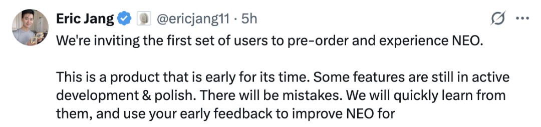我们仍在积极开发和完善部分功能,可能会出现失误,我们会迅速汲取经验,并利用用户的早期反馈来改进NEO。