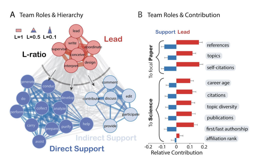 在获得领导概率后(以0.65为分界线区分领导者和支持者),他们将其应用于全球范围内的数百万篇合作论文,进一步构造两个关键指标: