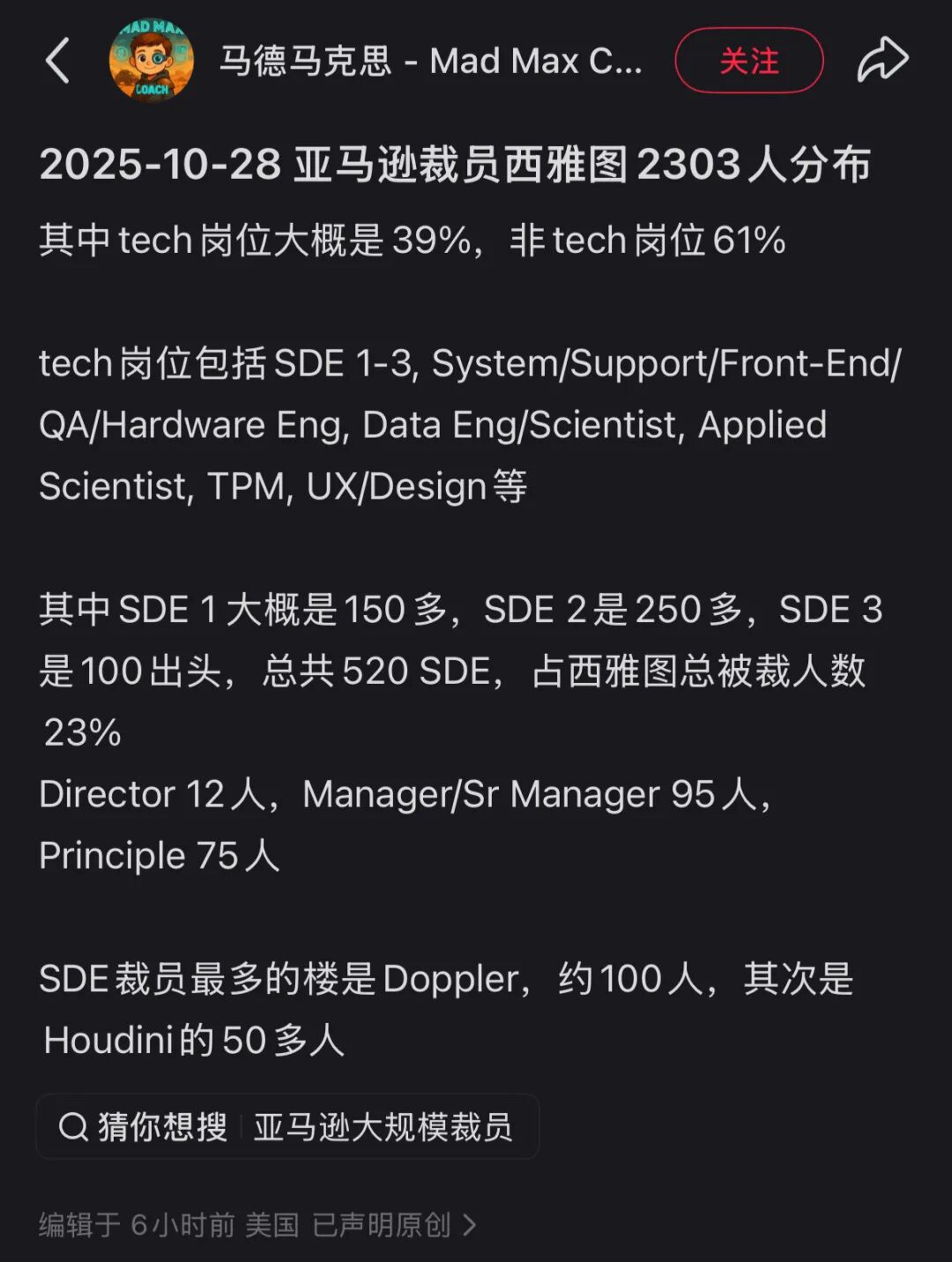 亚马逊内部甚至流传着一句玩笑话:「这次裁员连L7(对应Principal(首席)级别)都保不住。」