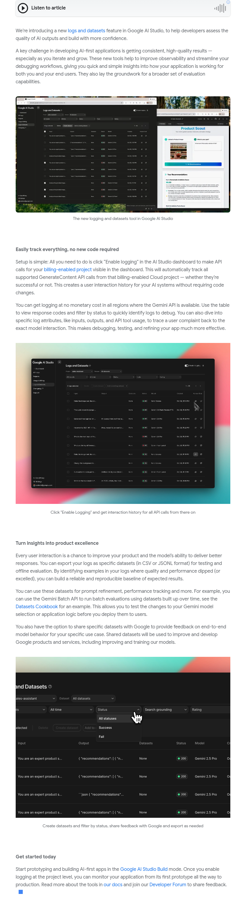 Google AI Studio 推出新的日志和数据集功能,帮助开发者评估 AI 输出质量并更自信地构建应用。该功能通过提升可观测性、简化调试流程,为迭代和扩展提供一致、高质量的结果支持。只需在仪表板中点击“启用日志”,即可自动记录已启用计费的云项目中所有支持的 GenerateContent API 调用,无需额外编码。系统会追踪成功或失败的请求,便于开发者快速了解应用表现。这些日志可导出至 BigQuery 进行深度分析,并用于创建评估数据集,优化模型提示和性能评估。新工具为后续更全面的评估能力奠定基础,助力开发者持续改进 AI 应用的实际效果与用户体验。