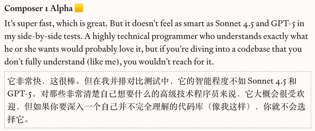 有人在对比测试中认为Composer非常快,这很棒,但是智能程度不如Sonnet 4.5和GPT-5。
