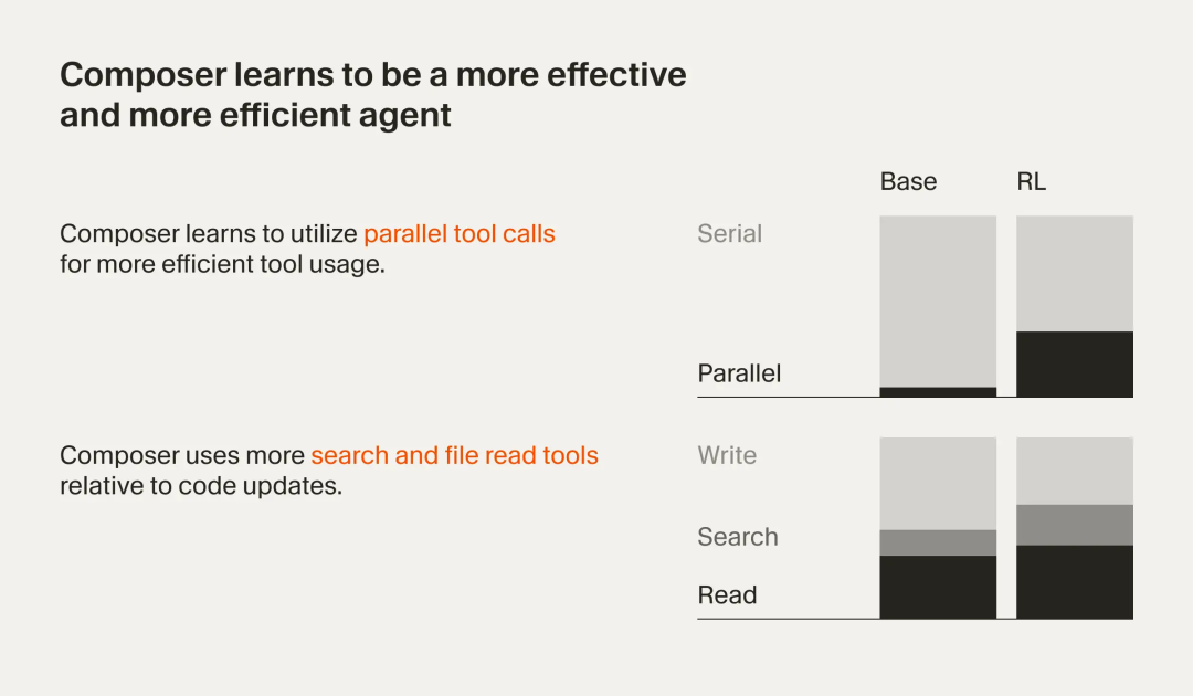 在RL过程中,模型会自发习得一些有用的能力,例如执行复杂搜索、修复linter错误,以及编写并运行单元测试。