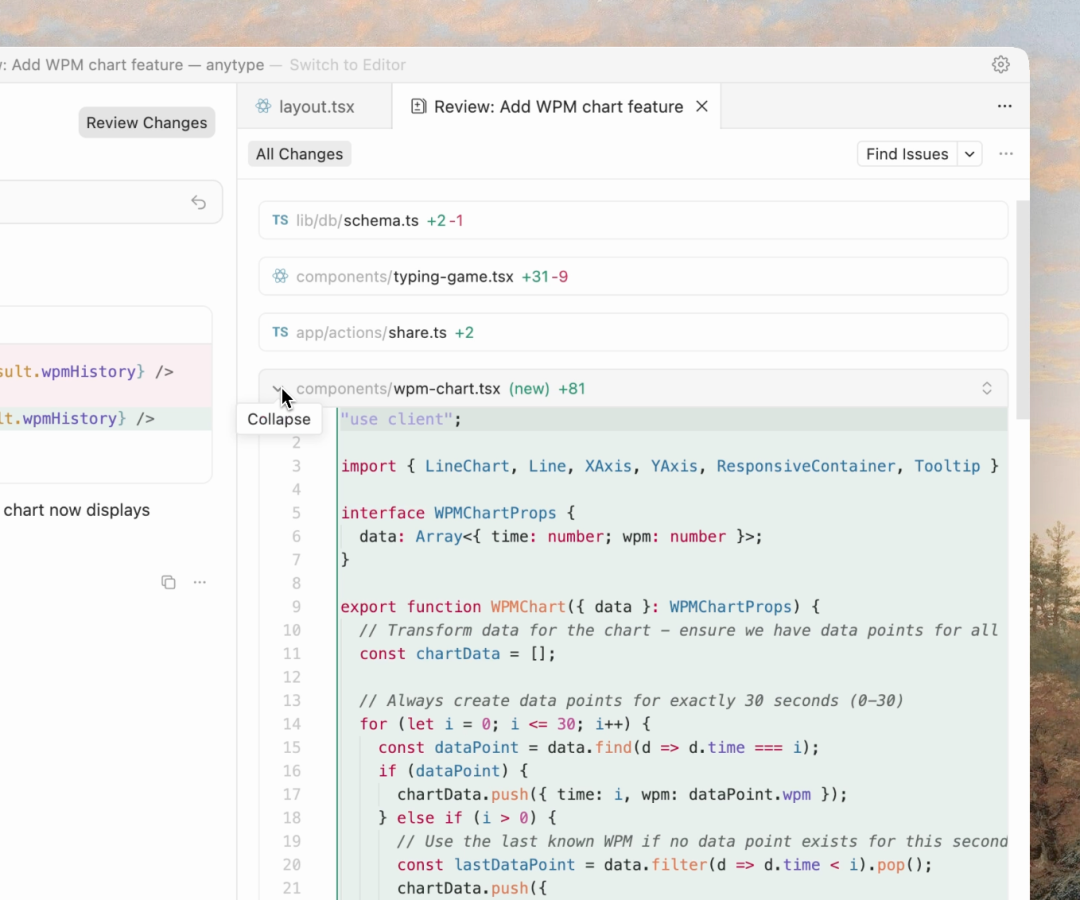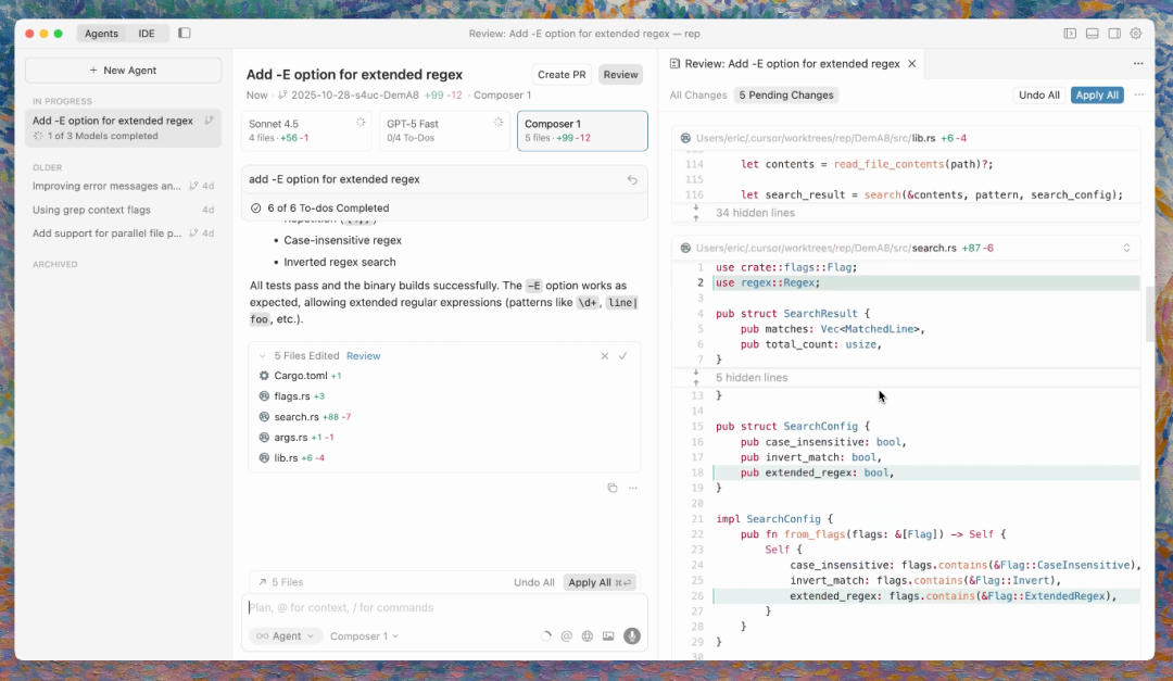 这次更新还引入了全新的代码审查功能,更容易查看 Agent 在多个文件中的所有更改,无需在各个文件之间来回切换。