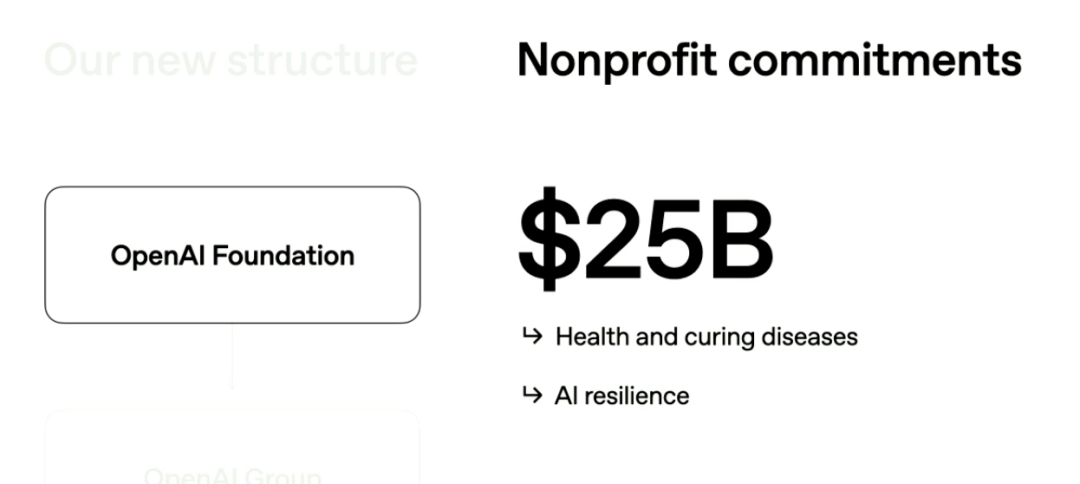 具体来说,OpenAI完成架构重组后,OpenAI Foundation得到250亿美元专项资金承诺,用于利用AI治愈疾病和AI韧性。