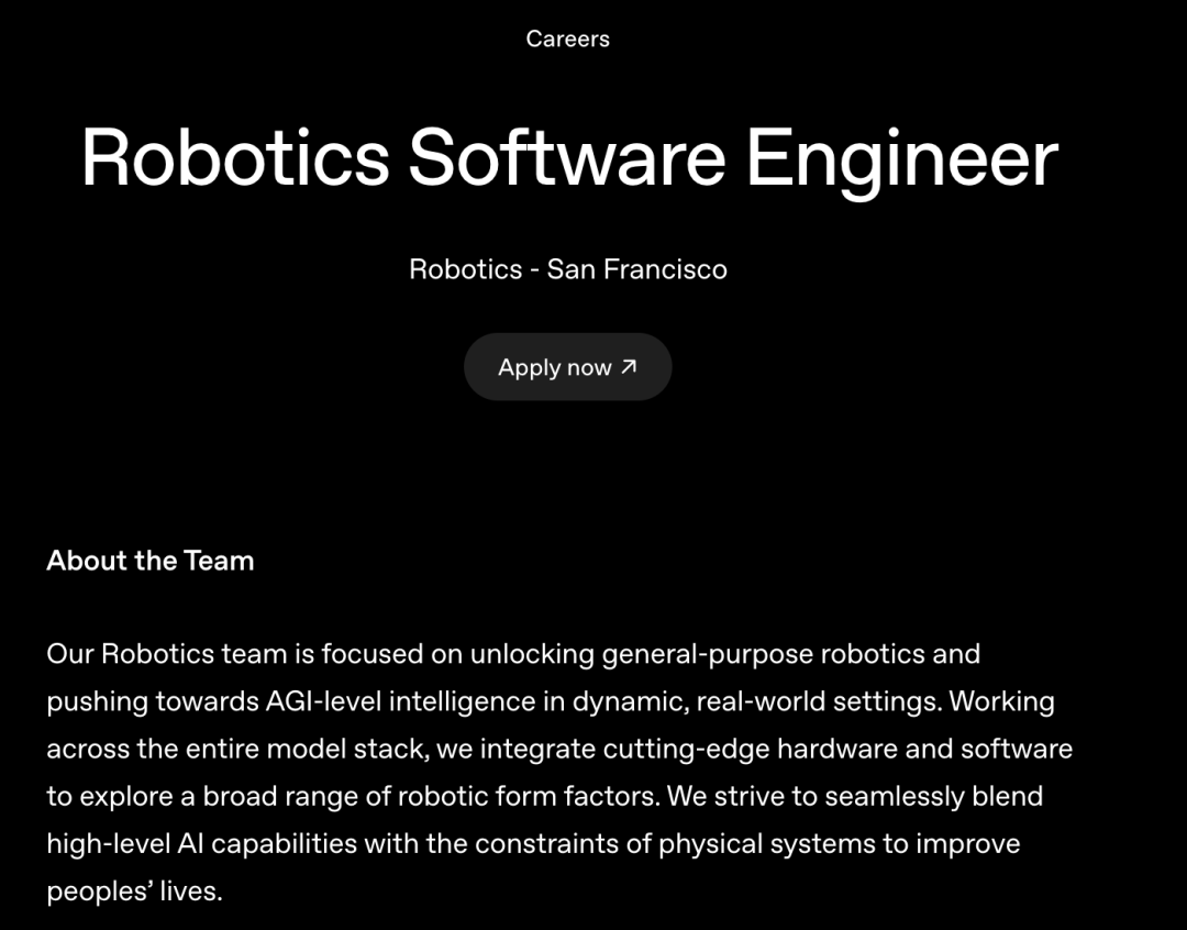 OpenAI机器人学软件工程师招聘称机器人学团队「专注于在动态真实环境中,推动和实现AGI级别的智能水平」