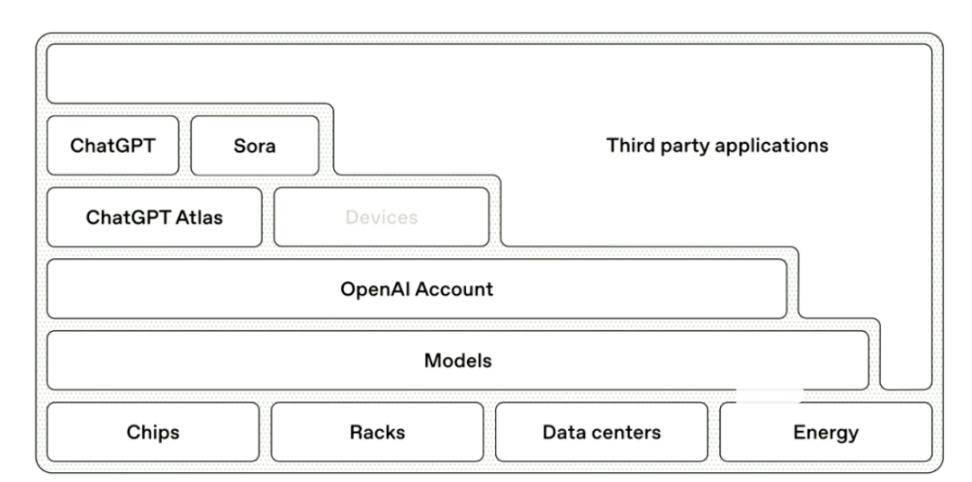 简单而言,在芯片、数据中心、能源等基础设施基础上,不断训练出新模型,用户通过OpenAI账号使用ChatGPT、Sora、ChatGPT Atlas浏览器等AI服务和产品。