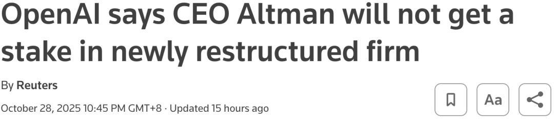 值得注意的是,OpenAI称奥特曼没有重组后公司的任何股权。