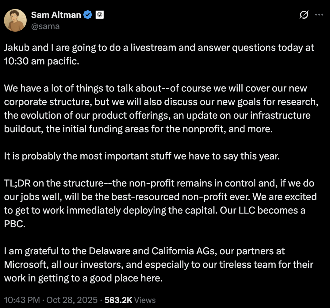 CEO奥特曼和首席科学家Jakub Pachocki,就OpenAI机构转型直播了1小时多,回答了现场提问。