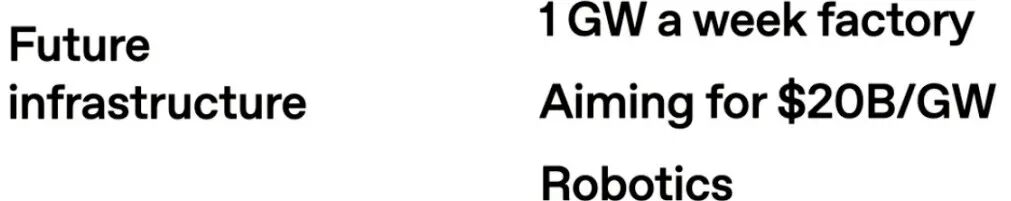 我们的目标是,打造一个基础设施工厂,实现每周1千兆瓦的计算产能。从愿景上说,我们希望能在这些设备的五年生命周期内,将成本大幅降至200亿美元左右。