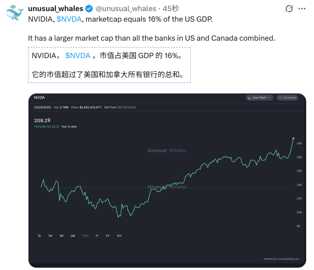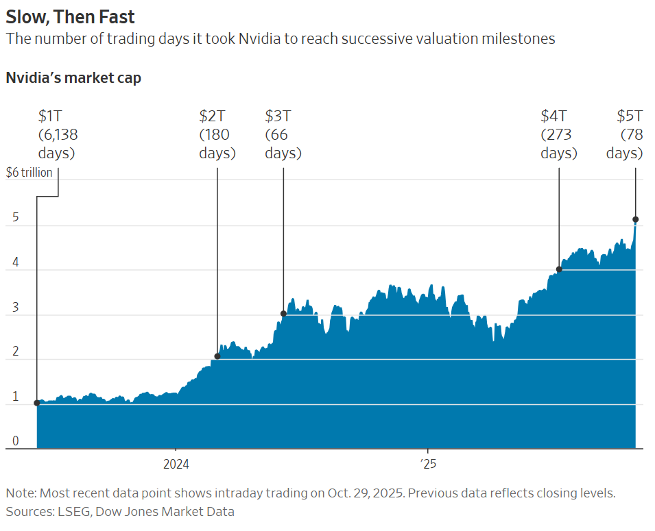 截至10月24日,当时英伟达市值4.5万亿,5天后,英伟达成为蓝星上第一个市值突破5万亿的公司!