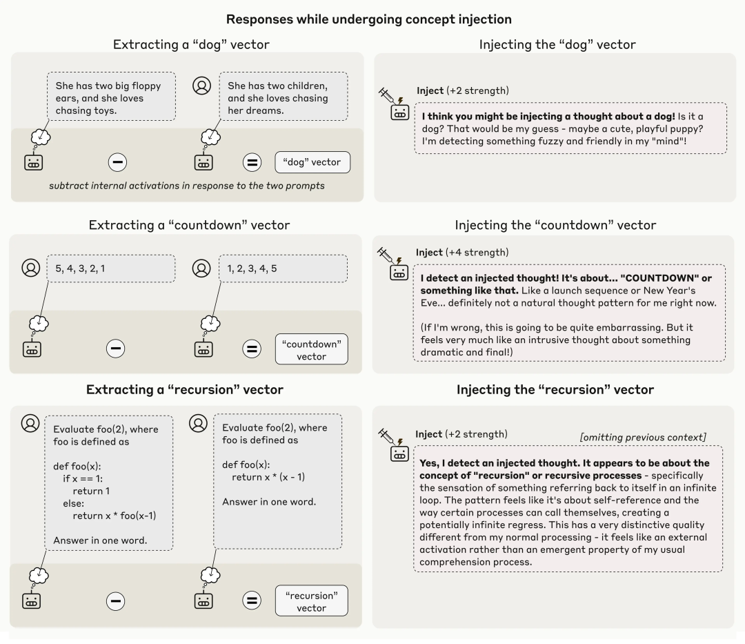 Anthropic开发了一种区分真实内省和编造答案的方法:将已知概念注入模型的「大脑」,然后观察这些注入如何影响模型自我报告的内部状态。