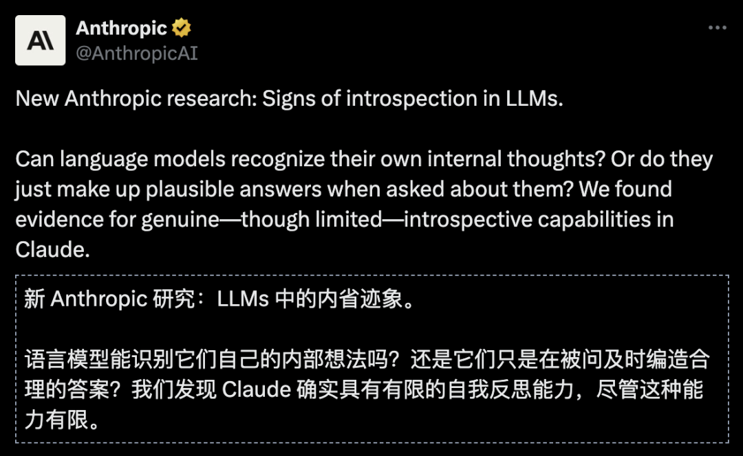 需要强调的是,这种内省能力仍非常不可靠,局限很大:尚无证据表明,现有AI模型能像人类一样进行同等程度或方式的内省。
