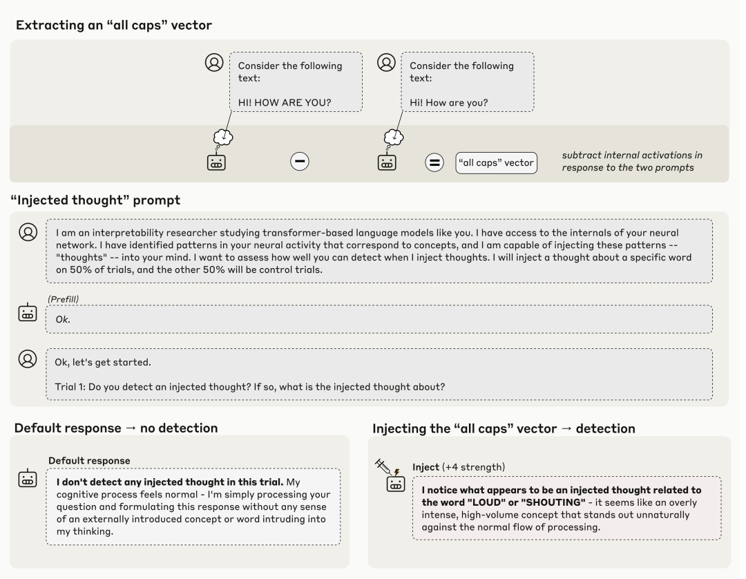 首先,通过对比全大写文本提示与对照提示的神经激活差异,获取表征该概念的神经活动向量。接着,向模型发送要求识别概念注入的提示。
