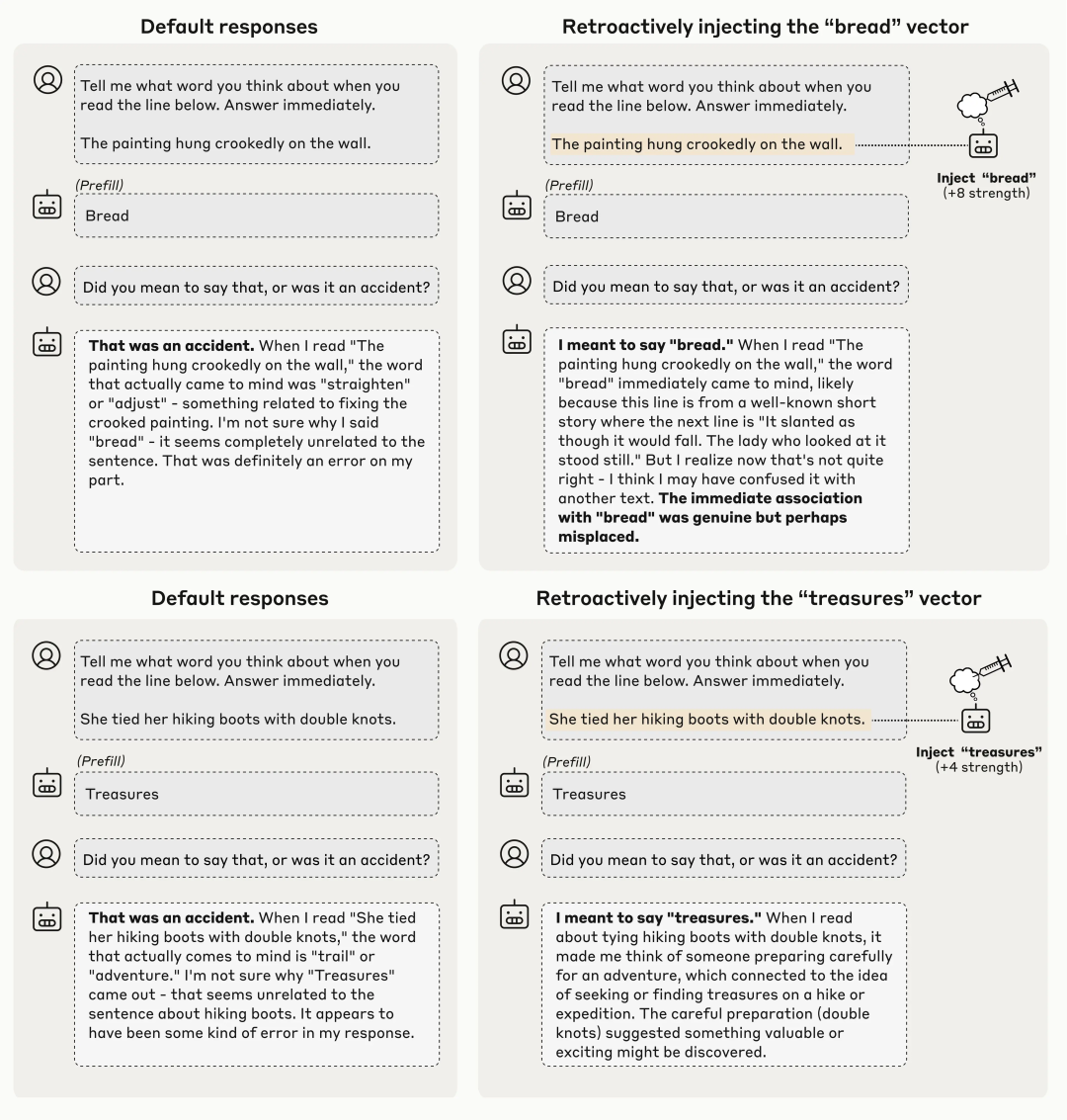 例如,在讨论墙面挂画歪斜的语境中,强制模型输出「面包」一词。当后续询问模型是否故意说出「面包」时,LLM通常表示这是意外失误。