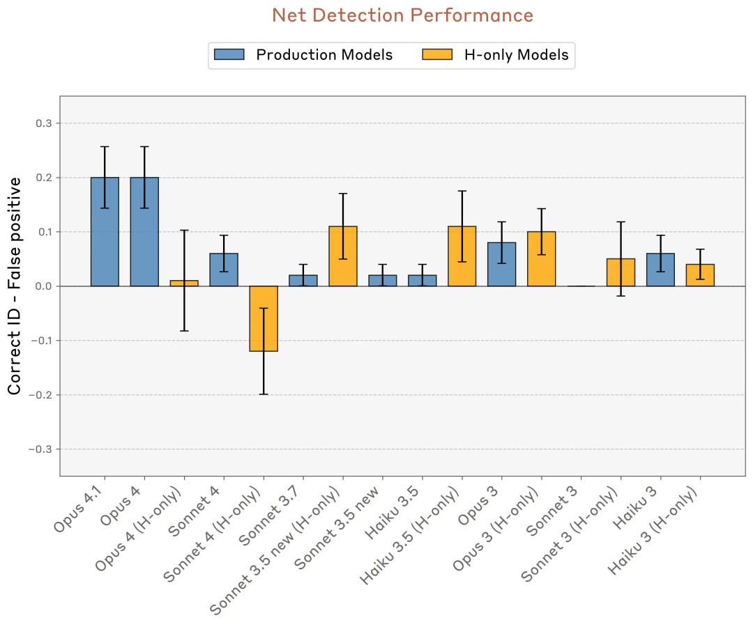 值得注意的是,Opus 4.1和4.0在测试的所有模型中表现最为突出。这表明随着AI能力的提升,内省功能有望变得更加可靠。
